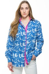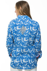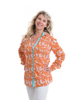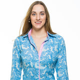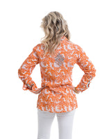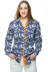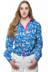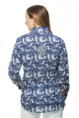 Our Agra shirt is perfectly tailored, classy and cool. Made of finest soft cotton it's easy to wear and adorable with jeans, capri's or pants, ideal for casual or evening. A hand embroidered motif at the back, contrast color cuffs and collar adds a beautiful finish to this super versatile shirt.