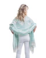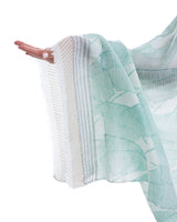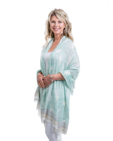 Clean, fresh, and tropical, the Key West Shawl breathes warmth and style. Turquoise green and white, this wrap boasts light, stylized, banana-leaf block print across the body of the piece. The geometric borders and soft selvage detail give the warmth and carefree look this shawl is made for. Perfect for the coming autumn, this wrap will protect you from the shorter days and nippy nights without sacrificing elegance or style. Simply throw the Key West Shawl over your favorite look and go!