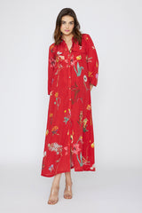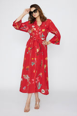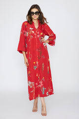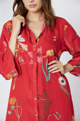 Lengthy and flowing, the Botanical shirtdress is a perfect all around piece for your wardrobe! Made from viscose cotton silk, it is cool and comfortable, perfect for night or day. Its design is the perfect mix between a classic Indian Achkan and a modern shirt dress. Easy to wear, with beautiful beaded embellishments on the back, this piece is lovely over white pants as a long and elegant top, or by itself for a graceful, flowing look.
