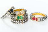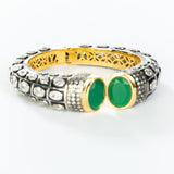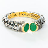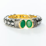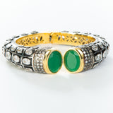 This handcrafted cuff is the perfect accent of elegance to bring you into any season. With its head of two bright, semi-precious stones, and body covered in enamel and Swarovski, this timeless piece is equally perfect for a summer cocktail night or a winter dinner party. Its gorgeous interior filigree and its center hinge make it both beautiful and easy to wear!