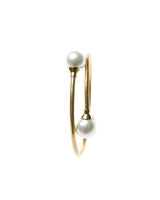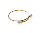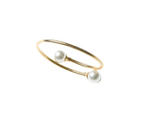 Gold and finished with two glowing pearls, this bracelet is the delicate statement piece you have been looking for. Simple, yet timelessly elegant, this small band is adjustable to size, making it the perfect fit for fashion and comfort. Its versititly and modern design make this classic piece a must-have. Professional in the daylight and elegant by night, this piece is the key you have been searching for to pull your look together.
