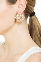 A stunning display of sparkle, the Shiloh Earrings are miles away from the everyday shiny earring. Replete with baguette-cut and rounded Swarovski crystals lying in gold settings, the dazzling geometric design of these earrings is truly a marvel. A hinge in the back supports the weight, making them not only stylish, but comfortable too! Whether at a summer brunch or a wintery dinner party, these earrings are guaranteed to catch the light, and will bring sunshine into any room they enter. Perfect for any and all occasions, style with your favorite look to add an extra flash of sparkle!