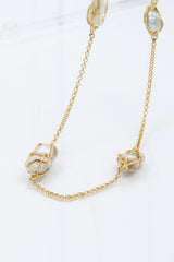 A modern take on a classic look, the Lola Necklace is truly a work of art! With gold wires gently encasing Baroque pearls, all suspended from a golden chain, this piece is the piece de resistance of the season. Stunning, elegant, and perfect for any season, the Lola Necklace is as versatile as it is beautiful. Style with your favorite evening look to add a sense of glamour and luxury to your attire.