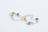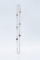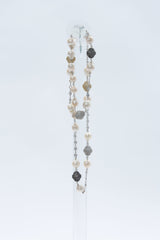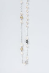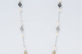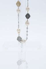 A modern take on the classic string of pearls, the Oxana Necklace is beautiful, fresh, and chic. Natural white pearls interspersed with crystal nuggets in gold, black, and white, are hung delicately on a golden chain replete with Swarovski crystals. The very picture of refinement, this necklace has a ‘20’s modernist touch to the design, mixed with classic shapes and twenty-first century style. Perfect in any season, and for any occasion, wear with your favorite evening look for an extra accent of elegance.