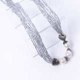 Cascading gently down to touch your collar bones, the Nina Necklace is the picture of grace and elegance. Its liquid design made from seven strands of sparkling quartzite culminating in a handful of shell pearls and crystal adornments make it the stand out piece of the season! A delicate but powerful statement piece, this necklace can be worn whatever the season, and is perfect for any occasion you care to wear it. Summer or winter, brunch or dinner, this necklace will never cease to be stunning! Style with your favorite look knowing with it on, the focus will be on you wherever you go.
