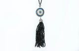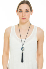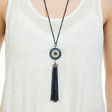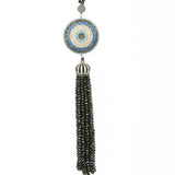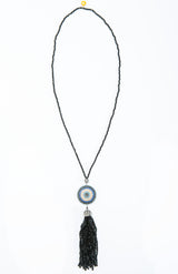 Ward off evil and stay stylish with the hand-crafted Lia Disc Tassel! Made of a multitude of colored crystals and ending in a crystal dome over a tassel of black quartz, this pendant is truly something to reckon with. Centered with a sparkling evil eye, and hung on a 20.5 inch cord, this statement piece is the must-have look of the season. Style with your favorite evening look to bring it to the next level!