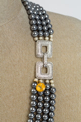 This beautiful necklace is not only a work of art, but a unique modern take on the classic fashion staple: a string of pearls. Shifting from white to grey, four strings of shell pearls are joined by a white-gold electroplated clasped inlaid with crystals and connected with silver beads. Perfect for summer cocktail evenings by the lake, or equally suited for a New Year’s Eve extravaganza, this necklace is as versatile as it is classic. Wear as a statement piece with your favorite seasonal look for the perfect aura of elegance.