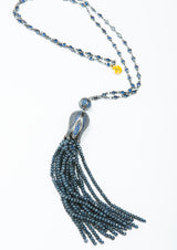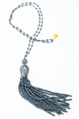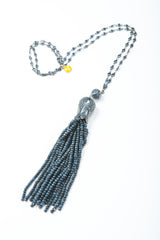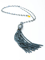 With its handcrafted chain, blue crystals, and tassel and dome, the Sophia Tassel Necklace is like nothing you’ve seen before. Crafted in the shape of a tulip opening to release the strings of natural blue quartz from its petals, the tassel dome is covered in shining blue crystals! A silvery chain set with blue crystals holds the pendant in place, and is beautiful all alone, not to mention the tassel! As an artistic touch at a cocktail party, or catching the light at a luncheon, this necklace never fails to steal the spotlight! Modern, chic, and entirely unique, the Sophia Tassel necklace is the statement piece of the season. Wear with your favorite look for a little added elegance.