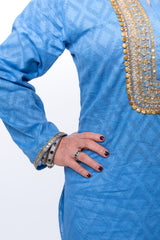 Embellished with gold hand embroidery detail, the woven cotton Ajmer Tunic is elegant, chic and travels easily from day to night.  This tunic exudes effortless cool perfect for any occasion!  Dress this tunic up or down with blue or white jeans with wedges or simple capri's and flats.