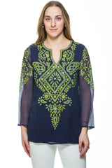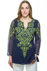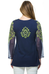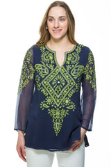This lined chiffon tunic gives you modesty and elegance all in one. Flowing lined chiffon covered in flowering hand embroidery, the Faith Tunic has all the fresh elegance you have been looking for. Style with long pants and statement earrings for a classy look!